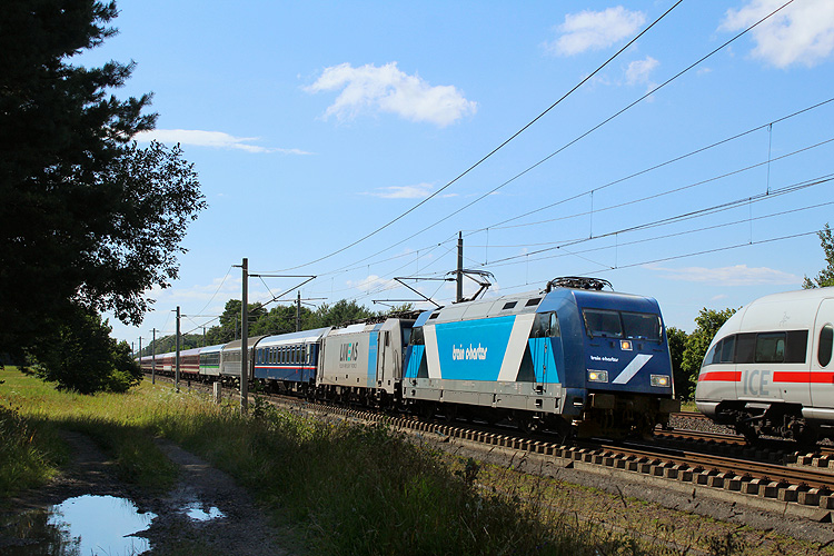 Am 16.07.2024 war der European Sleeper ES 453 Brüssel - Prag in Bad Bentheim liegengeblieben. So wurde der Zug samt der defekten Lineas 186 182 von TSC 101 133 bei Tageslicht nach Dresden überführt, ich nutzte die Chance für dieses Bild. |