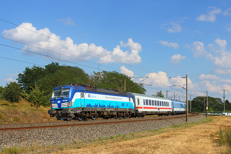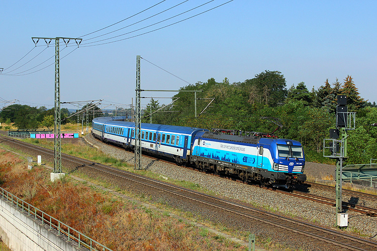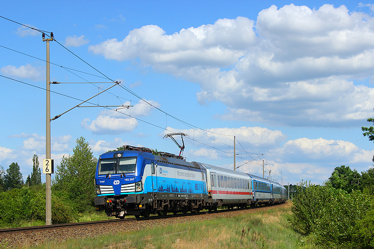 |  | An mehreren Terminen wurden im Sommer 2020 einige EC Prag - Hamburg wegen Bauarbeiten über Stendal umgeleitet. Am 22.06. war CD 193 297 mit dem EC 174 nach Hamburg unterwegs. |