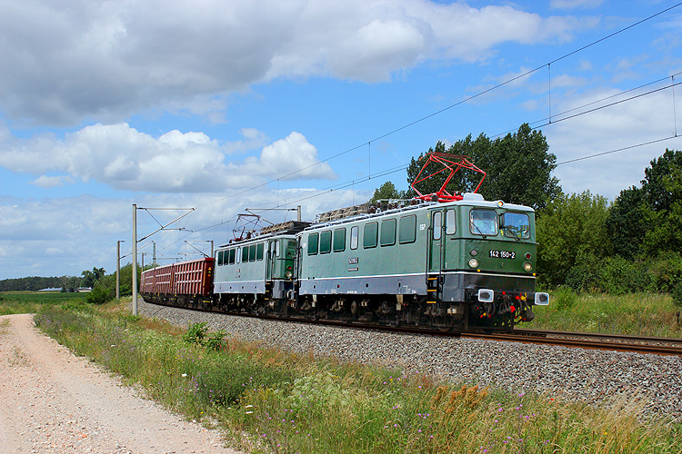 |  | Am 07.07.2020 kamen die beiden nun frisch lackierten EGP 142 150+118 mit dem E-Wagenzug DGS 69052 Wittenberge - Magdeburg Buckau über Stendal. |