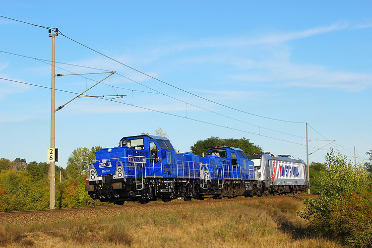 |  | Metrans 1002 037+011 waren zur Wartung im Alstomwerk gewesen und fuhren nun heimwärts nach Hamburg. Dabei nahmen sie auch noch 187 511 mit, die am Tage zuvor an der Demonstration der privaten Güterbahnen in Berlin teilgenommen hatte. |