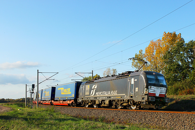 |  | Von Oktober bis Mitte Dezember 2020 wurden die Züge der Relation Rostock Seehafen - Italien wegen Bauarbeiten südlich von Berlin über Stendal umgeleitet. Am 22.10.2020 konnte ich so Mercitalia 193 704 mit dem LKW-Walter-KLV KT 42143 nach Verona aufnehmen. |