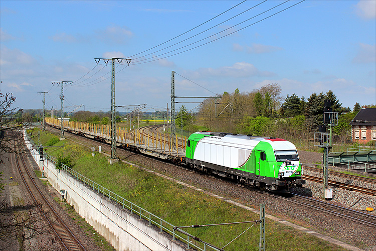 Im Auftrag der SETG fahrend erreichte am Morgen des 26.03.2017 193 804 mit dem Holzzug aus Rostock-Bramow den Bahnhof Borstel. |