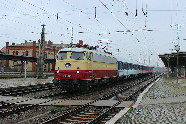 Mit einer Wagen-Überführung von Delitzsch nach Wittenberge - Löhne kam am Karfreitag (25.03.2016) E 10 1309 der AKE durch Stendal gefahren. |
