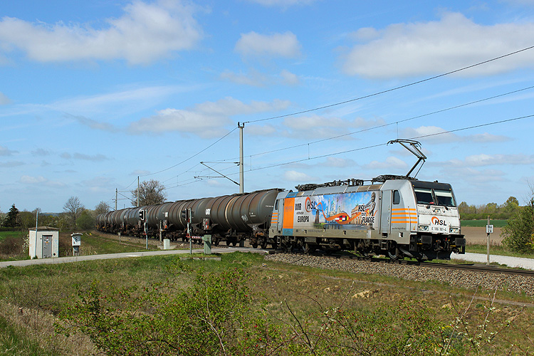 HSL 186 181 "Wir verbinden Europa - HSL zeigt Flagge" hing am 22.04.2016 vor dem Kesselzug Hamburg - Salzwedel - Berlin. |