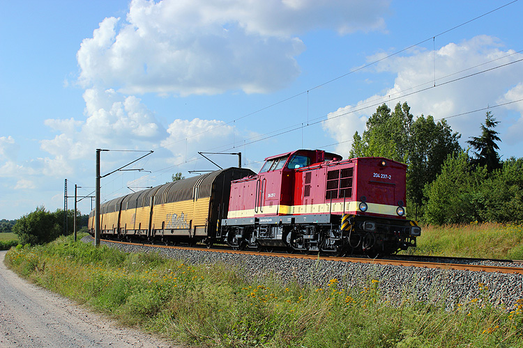 204 237 fährt nun für die MTEG und hat wieder ihre Reichsbahn-Lackierung zurückerhalten. Die Zugleistungen blieben aber die gleichen, mit dem leeren BMW-Zug von Hamburg nach Leipzig rollte sie am 31.07.2014 aus Richtung Wittenberge kommend heran. |