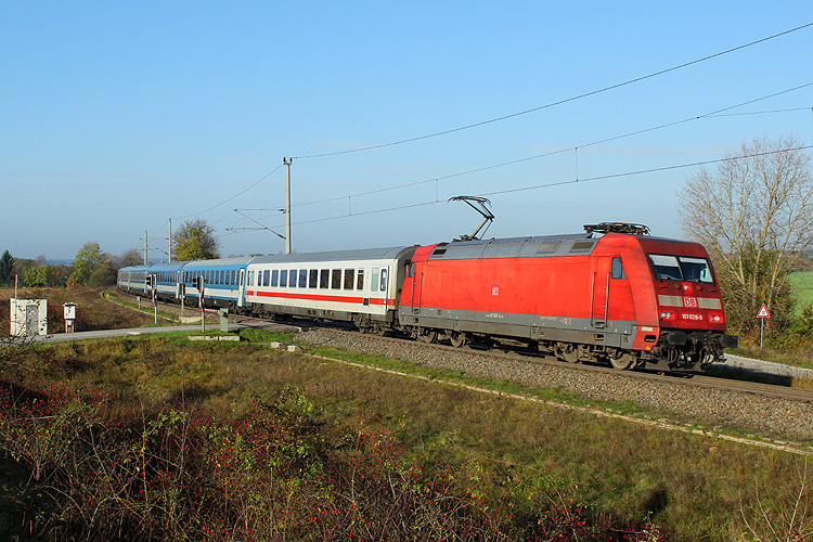 Vom 31.10. bis 02.11.2014 wurde wegen Bauarbeiten bei Hagenow Land der komplette Fernverkehr Hamburg - Berlin über Salzwedel - Stendal umgeleitet. Einer der Umleiter war der EC 175 Hamburg - Budapest, hier am 02.11. mit 101 028 bei der Einfahrt nach Stendal aufgenommen. |