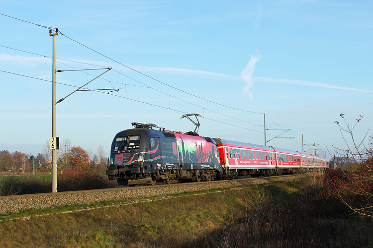 Immer wieder schön anzusehen ist die Stammlok des IRE Berlin - Hamburg 182 509 von MRCE. Am 23.11.2014 zeigte vor dem IRE 18598 mal ihre andere Seite zur Sonne. |