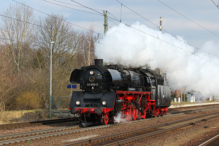 Bei einer ganz normalen Fototour nach Niederndodeleben überraschte mich am 13.03.2015 die Hallenser 03 1010, die solo westwärts fuhr. |