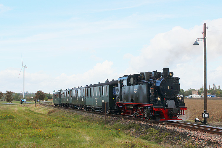Auch eine Mitfahrt auf der Mansfelder Bergwerksbahn war im Preis inklusive, Lok 11 fährt hier aus Hettstedt Kupferkammerhütte kommend in Benndorf ein. |