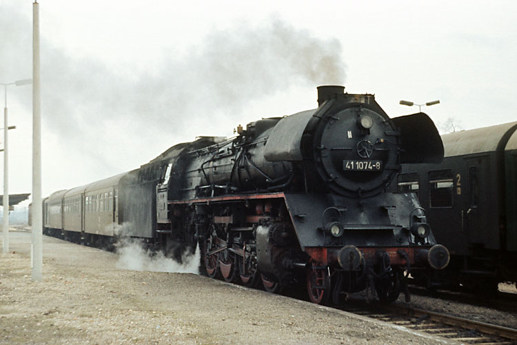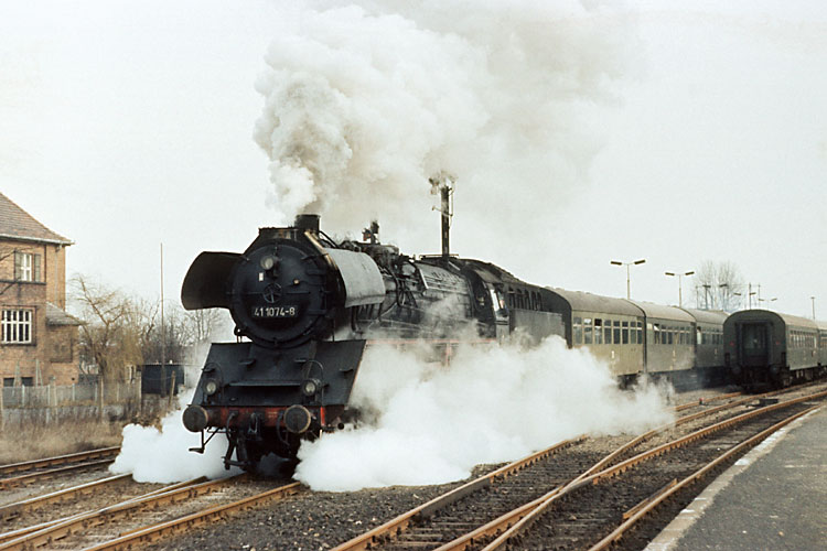 41 1074 Bw Oebisfelde steht mit dem P 6451 im Bahnhof Salzwedel zur Abfahrt bereit, 14.03.1982. |