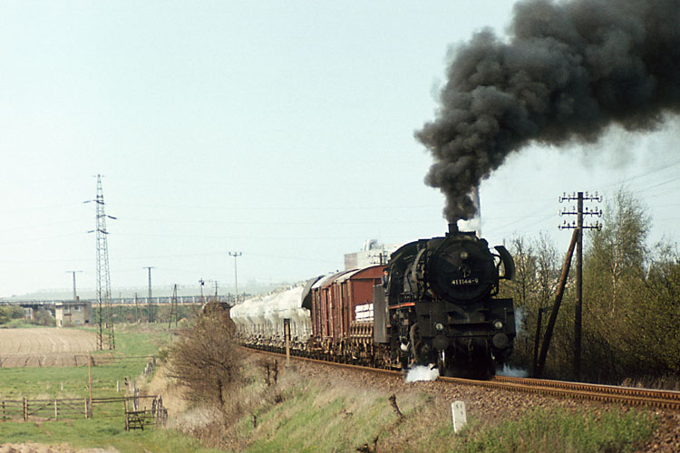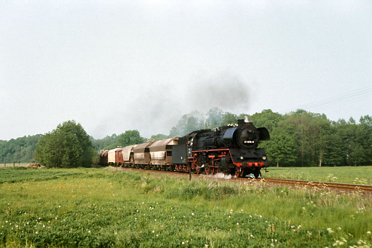 Die Oebisfelder 41 1144 hat mit dem N 62713 nach Oebisfelde den Abzweig Jeetze nahe der Ortschaft Sienau passiert, 09.05.1982. Dort zweigte die Strecke nach Kalbe / Milde über Badel ab, die kurz darauf stillgelegt wurde. In Betrieb blieb nur das kurze Stück bis Krinau, dem Verladebahnhof der Salzwedeler Düngemittelwerke. |