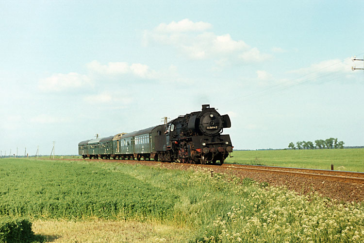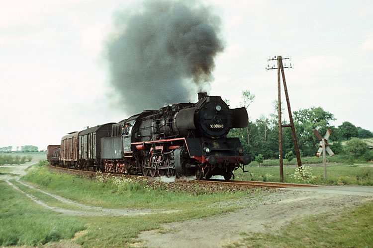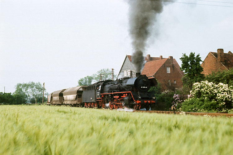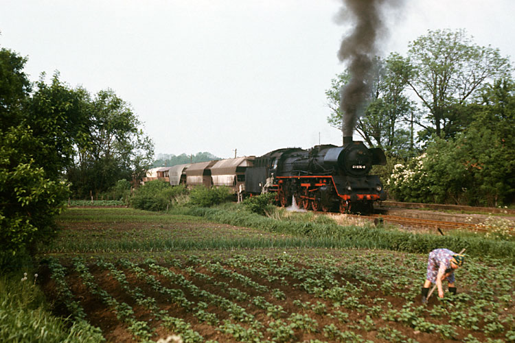 Der Zug verläßt nach der Fertigstellung Beetzendorf wieder in Richtung Oebisfelde, 26.05.1984. Das war das letzte Mal, das ich auf dieser Strecke eine Dampflok im Plandienst erlebte. Wir haben nun alle Strecken der Altmark, auf denen in den Achtzigern noch mit Dampf gefahren wurde, bereist. Damit ist unsere Altmarkrundreise beendet! |
