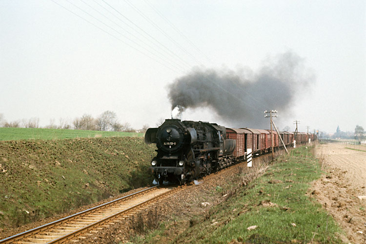 Nur kurze Zeit befuhren die in Salzwedel neuen Reko 52 die Strecke, hier hat 52 8172 mit dem Dg 50811 Wittenberge - Oebisfelde - Magdeburg Klötze durchfahren, 22.04.1984. Die Salzwedeler Dampflok bespannte den Zug auf dem Abschnitt Wittenberge - Oebisfelde, nach Magdeburg ging es mit Diesel weiter. Der Umlauf Dg 50811 - N 62714 war die letzte planmäßige Dampfleistung dieser Strecke, fünf Wochen später war die Strecke damit dampffrei! |