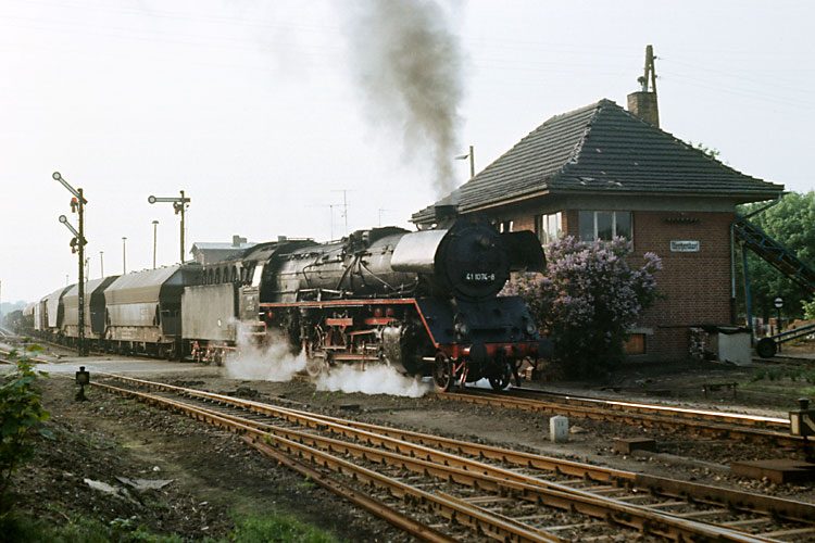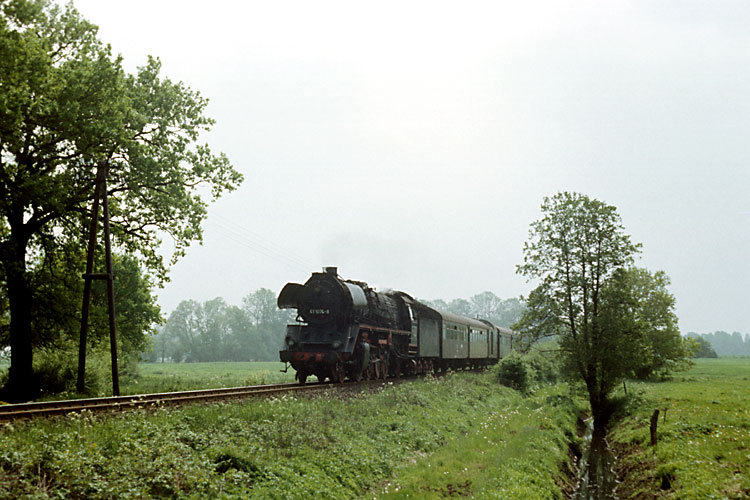 Am 26.05.1984 bespannte das Bw Oebisfelde nochmals außerplanmäßig den Umlauf P 6446 - N 62713 mit Dampf, 41 1074 rollt hier mit dem P 6446 bei Vitzke Salzwedel entgegen. An diesem Tag gab es in der Altmark eine Dampfsonderfahrt nach Klötze mit 64 007, die 41 war als Schmankerl für die angereisten Eisenbahnfreunde gedacht. |