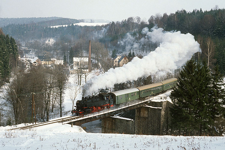 86 1001 hatte unterdessen eine Runde nach Markersbach gedreht und ist hier mit dem P 8696 bei Raschau auf der Rückfahrt nach Aue. |