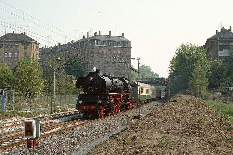 Mein erstes Bild dieses Plandampfes machte ich frühmorgens am 06.05.1992, 41 1231 war da schon mit dem D 700 Gera - Berlin unterwegs und dampft über das Viadukt in Leipzig-Wahren. |