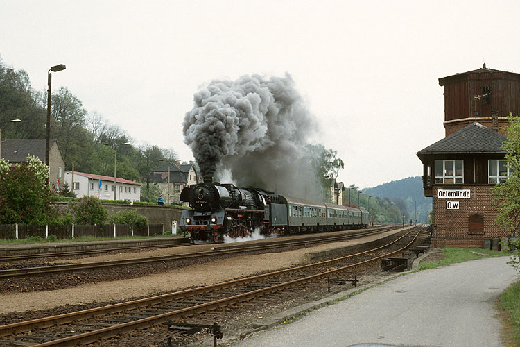 Am letzten Veranstaltungstag gab es Volldampf auf der Saalebahn. 03 1010 fuhr unter anderem den bekannten P 3003 Halle-Saalfeld und verläßt mit diesem den Bahnhof Orlamünde, 09.05.1992. |