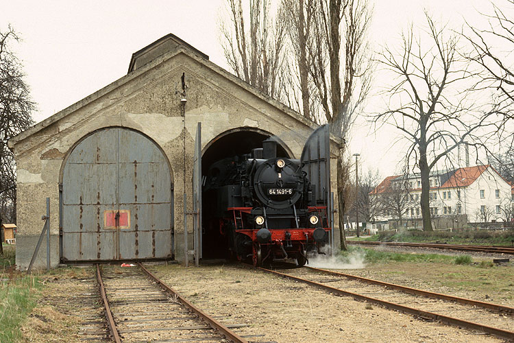 Im Frühjahr 1994 war sogar der alte Triebwagenschuppen im Bahnhof Kalbe(Milde) noch befahrbar, 64 1491 posiert für die Fotografen, 10.04.1994.