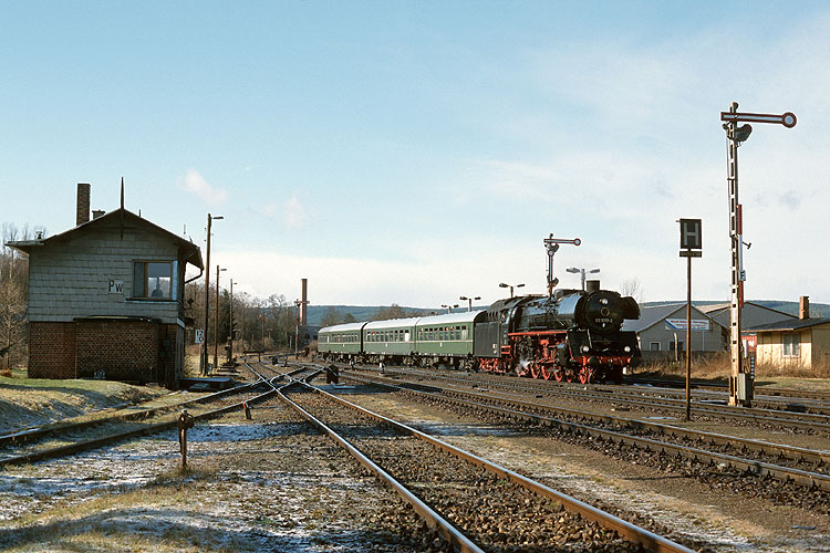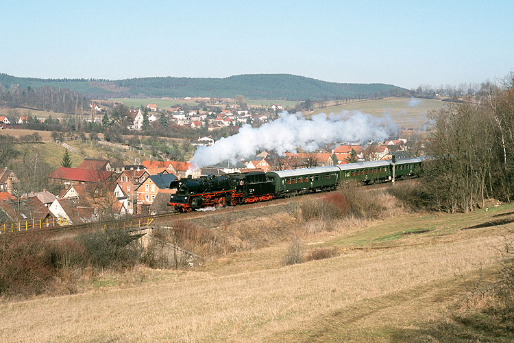 Erst im Februar 2001 ließ ich mich mal wieder bei einem Plandampf blicken, beim "Goldene Aue #3" in Thüringen. An den Veranstaltungstagen herrschte leider trübes Wetter, aber die Zuführung der Glauchauer 35 1097 am 16.02.2001 lief bei bestem Wetter ab. So konnte ich unter anderem diese Aufnahme in Pößneck machen. |