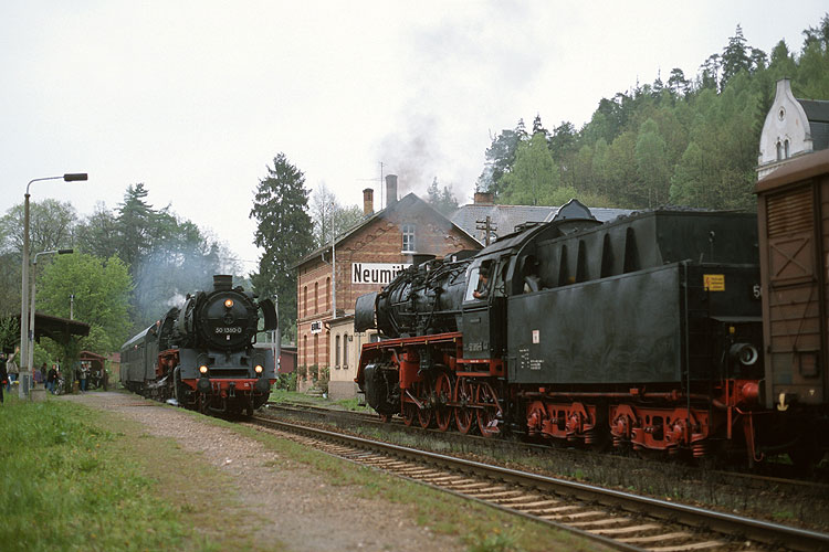 Am 05.05.2001 gelang mir im Bahnhof Neumühle auf der Elstertalbahn dieses Bild - 50 3616 mit Fotogüterzug nach Plauen kreuzt mit der RB 26190 Weischlitz-Gera, die von 50 1380 (alias 50 3501) gezogen wurde. |