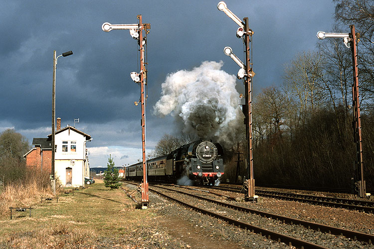 Beim "Metropol"-Plandampf im Frühjahr 1994 gab es neben Schnellzügen Magdeburg-Berlin und Berlin-Frankfurt(O) auch Eilzugeinsätze auf der Ostbahn nach Küstrin. An der Signalbrücke des Bahnhofes Müncheberg vorbei fährt hier 03 2204 mit dem E 305 Berlin-Gorzow aus, 01.04.1994. |