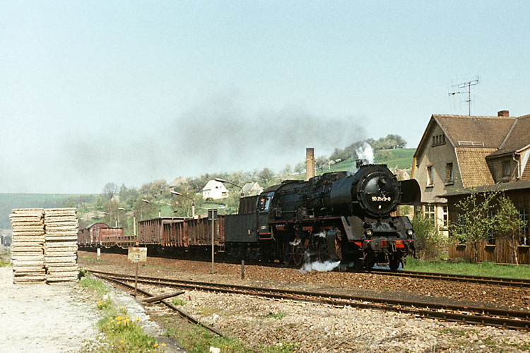 15.05.1982 - Mein erstes Bild einer 50 mit der Anschrift "Rbd Dresden" - 50 3529 vom Bw Nossen durchfährt mit dem N 61345 Döbeln - Dresden den Bahnhof Gleisberg-Marbach. Zwei Jahre eher hätte ich nicht so weit für diese Lok fahren müssen, denn da war sie noch beim Bw Stendal beheimatet. |