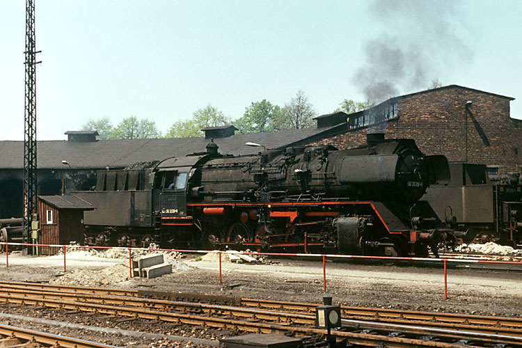 Blick ins Bw Nossen am 16.05.1982, 50 3539 steht einsatzbereit an der Drehscheibe. |