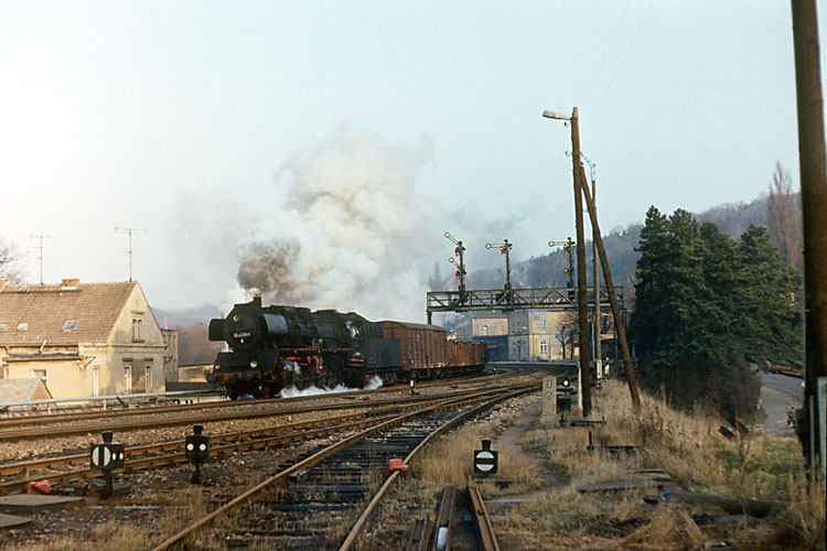 50 3536 war inzwischen mit ihrem N 61348 bis Roßwein gekommen und verläßt den Bahnhof in Richtung Döbeln, 19.12.1982. |