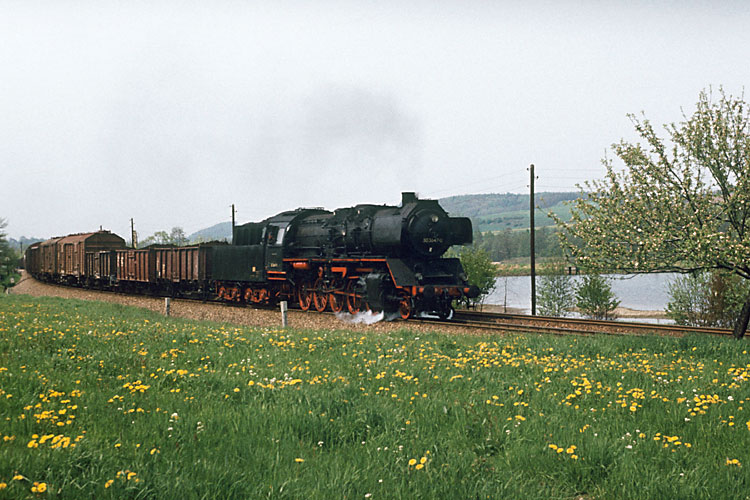 Mein erstes Bild von einer für das Bw Aue fahrenden Karl-Marx-Städter 50 - bei Weißbach fuhr mir 50 3647 mit dem Dg 54311 Zwickau - Aue vor die Linse, 07.05.1983. |