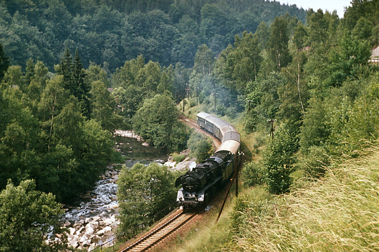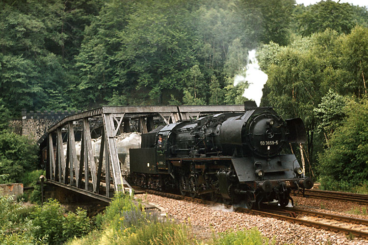 Landschaftlich sehr reizvoll war das noch bis Blauenthal betriebene Reststück der durch einen Talsperrenbau teilweise gefluteten Strecke Aue - Adorf. Diese Verbindung wurde in den Achtzigern nur noch wochentags von Personenzügen befahren. Der Nachmittagszug P 17624 war zeitweise im Plan der Auer 50 enthalten, so wie hier am 30.06.1983 mit 50 3659 kurz hinter Aue. |