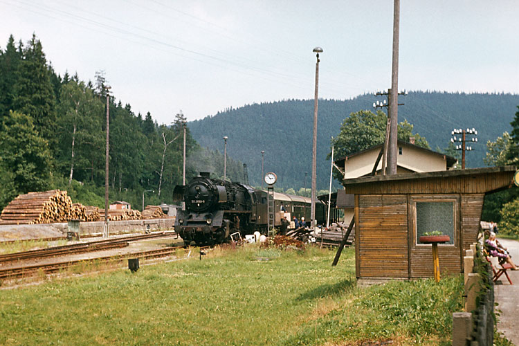 Auch in Johanngeorgenstadt konnte nicht gedreht werden, so das die Auer 50 3600 bei Schwarzenberg-Neuwelt mit dem P 9670 nach Aue ebenfalls Tender voran daher kam, 23.07.1985. |