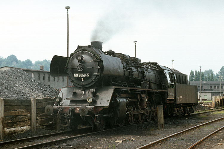 50 3659 pausiert nach der Beförderung des Dg 54311 im Bw Aue, 03.07.1983. |