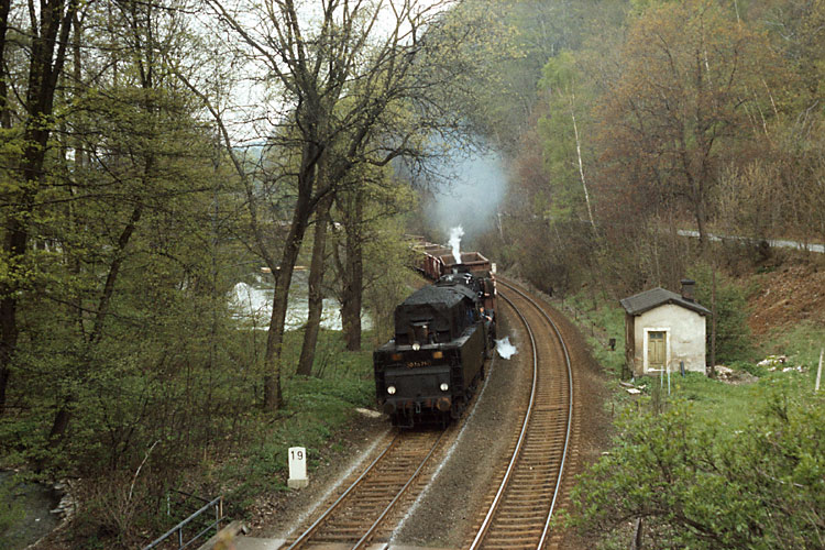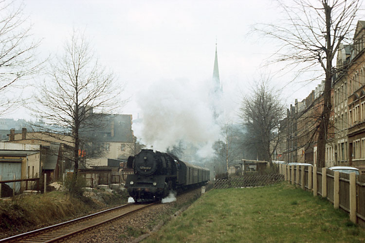 Für die Einsatzstelle Zwickau lief am 11.05.1985 50 3671 und fuhr unter anderem den Dg 54307 von Zwickau nach Schwarzenberg. Da die Lok in Schwarzenberg für die Rückfahrt nach Zwickau nicht gedreht werden konnte, mußte eine Richtung mit dem Tender voran bewältigt werden. |