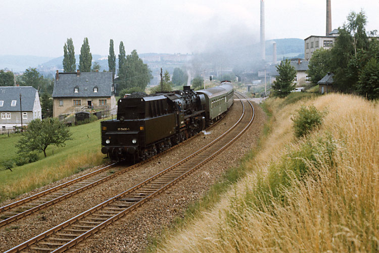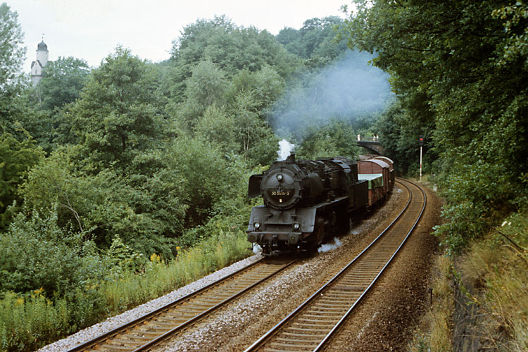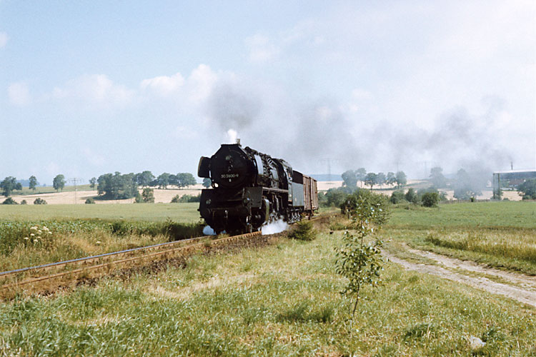 Am nächsten Tag bespannte 50 3616 den Dg 54309 von Zwickau nach Aue, aufgenommen bei Hartenstein, 28.07.1985. |