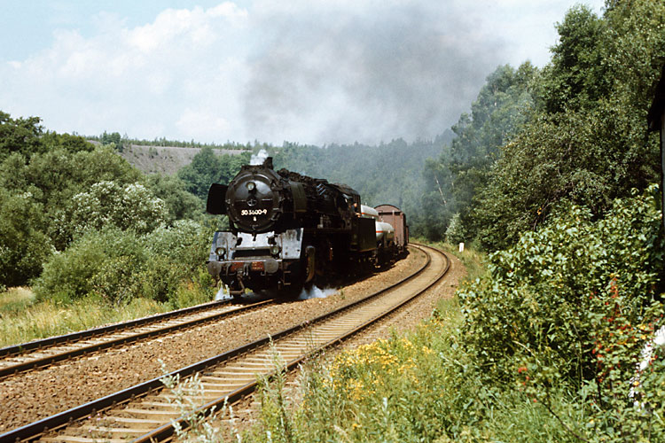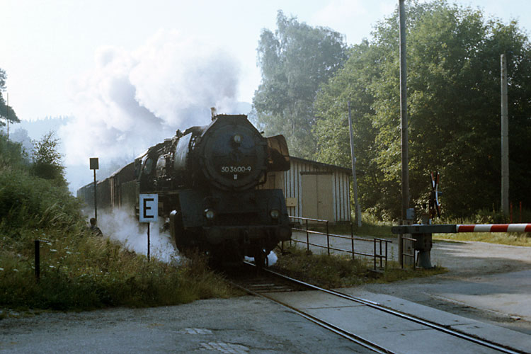 Eine Stunde später konnte ich bei Schlema schon den nächsten Durchgangsgüterzug der Strecke Zwickau - Aue aufnehmen, 50 3600 vom Bw Aue mit dem Dg 54309, 27.07.1985. |