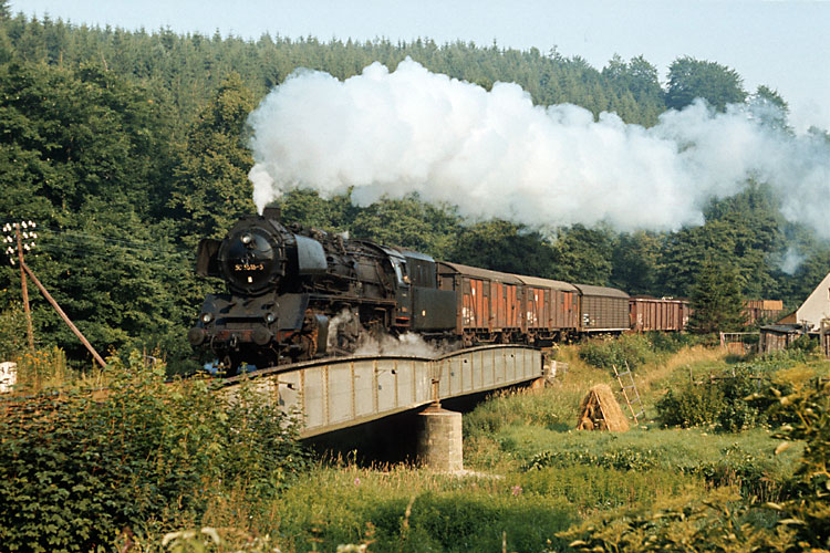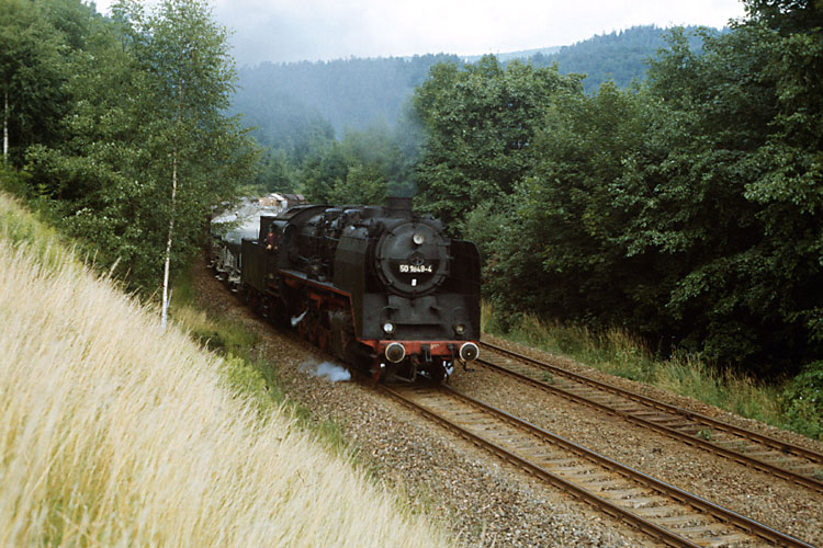 Die Zwickauer Traditionslok 50 1849 wurde gelegentlich auch im Plandienst eingesetzt, so wie hier am 27.07.1985 mit dem Dg 54307 bei Schwarzenberg-Neuwelt. |