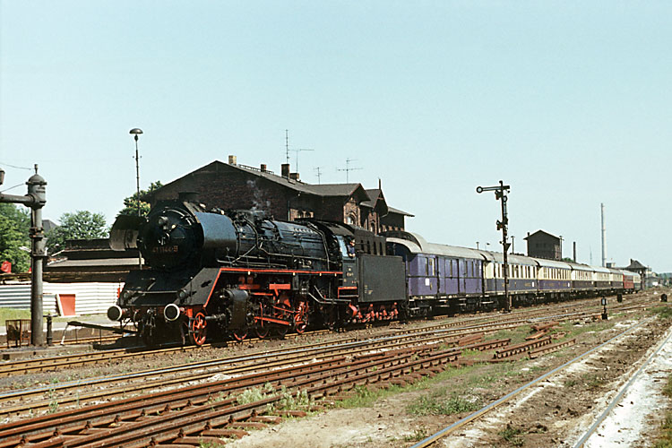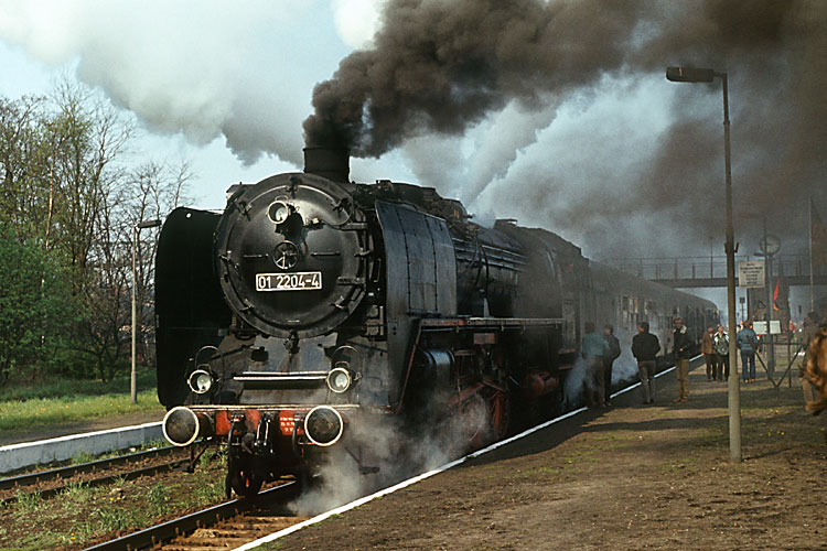 Meine allererste Sonderfahrt führte mich am 08.05.1982 in den Norden der DDR. Der BV Schwerin des DMV hatte für seine traditionelle Frühlingsfahrt 01 2204 als Zuglok ausgewählt. Die Lok war zu dieser Zeit beim Bw Wismar beheimatet und sollte bald in den Westen verkauft werden. Die Route des Zuges war Rostock-Güstrow-Karow-Pritzwalk-Wittenberge. Ich fuhr im Zug mit und kam bei den vielen Fotohalten voll auf meine Kosten. Beispielhaft hier der Fotohalt mit Scheinanfahrt am Posten 363 bei Güstrow. |