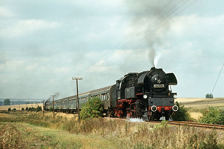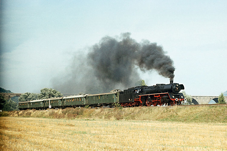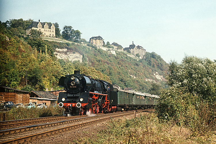 Ende September 1982 fand die erste Fahrt des Programmes "Garantiereisen" des Reisebüros der DDR für westdeutsche Eisenbahn-Freunde statt. Die viertägige Tour begann am 25.09.1982 mit 03 1010 von Leipzig nach Saalfeld, aufgenommen im Saaletal an den Dornburger Schlössern. |