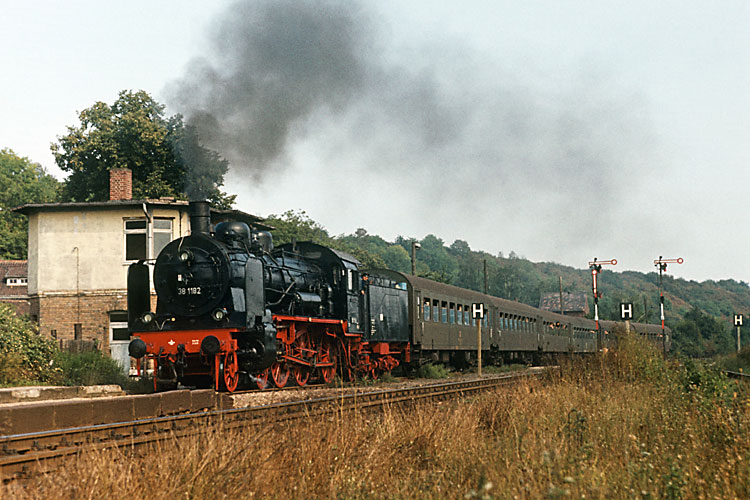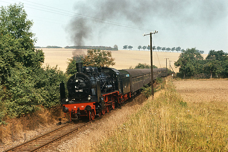 Zwei Wochen später war ein Sonderzug für den BV Erfurt des DMV von Sangerhausen über Bretleben und Sondershausen nach Nordhausen unterwegs. Zum Einsatz kam die nach langer Abstellzeit wieder reaktivierte Museumslok 38 1182, die fortan vom Bw Gera betreut wurde. Trotz der vielen (disziplinierten) Fahrtteilnehmer kam man bei den Fotohalten voll auf seine Kosten, wie hier bei Göllingen. |