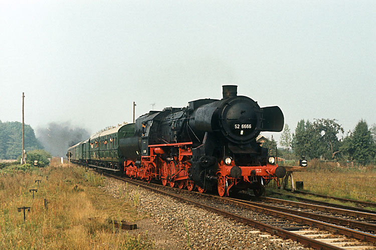 Eine Woche später war es schließlich der BV Berlin des DMV, der zu einer Rundtour Berlin-Werbig-Wriezen-Berlin eingeladen hatte. Die motorisierten Zugverfolger, zu denen auch ich dieses Mal zählte, narrte man morgens erst einmal, denn eigentlich war der Rundkurs andersherum angekündigt. So warteten viele vergebens an der Wriezener Strecke auf den Zug. Deshalb schaffte ich meine erste Aufnahme des mit 52 6666 und 74 1230 bespannten Zuges erst bei der Einfahrt in den Bahnhof Werbig, 18.09.1982. |