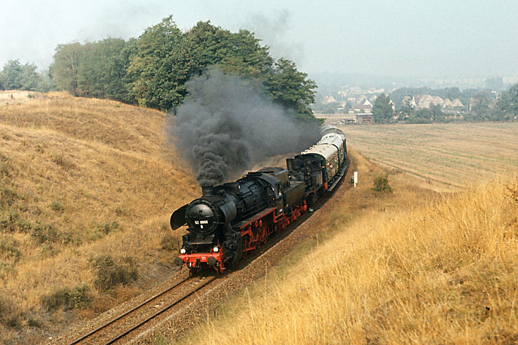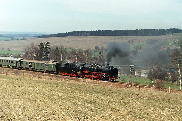 Ab Plauen übernahm die Zwickauer 50 849 die Weiterbeförderung des Zuges, hier kurvt er bei Rebersreuth durch das Vogtland. |