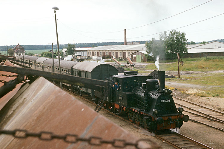 Am 18.06.1983 gab es endlich mal wieder eine Sonderfahrt auf den Gleisen der altmärkischen Kleinbahnen. Der BV Magdeburg des DMV fuhr an jenem Tag einen Zug von Stendal über Kalbe und Badel nach Jeggeleben Süd und zurück. Hier ist 89 6009 auf der Rückfahrt an der Hochrampe des Bahnhofs Badel zu sehen. |