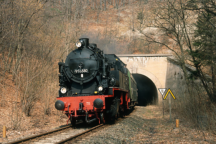 Mit der Eisenacher 91 6580 wurde zu Ostern 1991 eine Fahrt von Gotha über Leinefelde nach Geismar und zurück organisiert. So kam endlich auch mal wieder ein Dampfzug auf das schon zu DDR-Zeiten bedeutungslos gewordene Teilstück der Kanonenbahn Leinefelde-Geismar-(Eschwege) mit seinen Tunneln und Viadukten. Diese Tour ließ ich mir nicht entgehen, hier verläßt der Zug auf der Hinfahrt einen der Tunnel bei Großbartloff, 30.03.1991. |