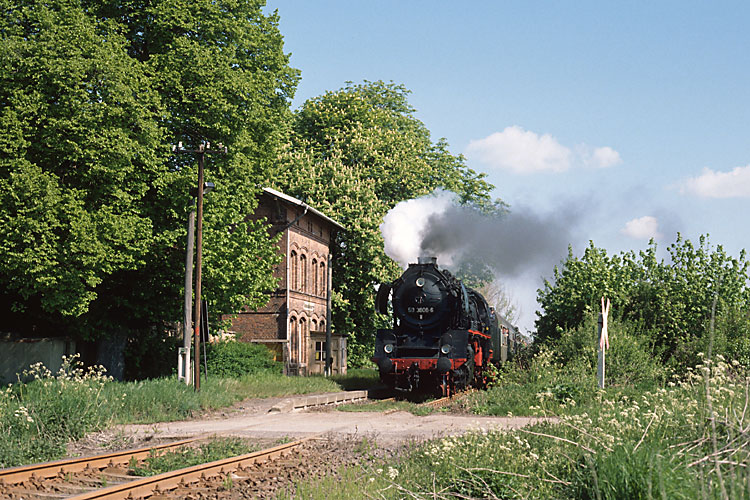 Nach dem Aus für die Oebisfelder Eisenbahn-Freunde wird die Reichsbahn-Tradition in der Altmark nun vom Mitte der neunziger Jahre entstandenen Verein "Lokschuppen Salzwedel" fortgeführt. Dort steht vor allem der Erhalt des alten Bahnbetriebswerkes Salzwedel im Vordergrund, wo mehrmals im Jahr Lokschuppenfeste gefeiert werden. Streckenfahrten gibt es leider nur selten und wenn dann wird meist von Salzwedel nach Arendsee und zurück gefahren. Hier rollt Gastlok 50 3695 aus Staßfurt an der nun restaurierten Arendseer Windmühle vorbei dem Bahnhof des Ortes entgegen, 25.04.2004. |