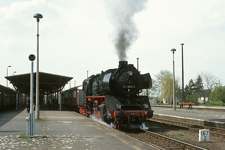 Für die Herbstfahrt am 03.10.1992 ins Eisenbahn-Museum Schwerin nutzten wir wieder unsere Vereinslok 50 3606, die gerade ihren Zug in Oebisfelde an den Bahnsteig rangiert. |