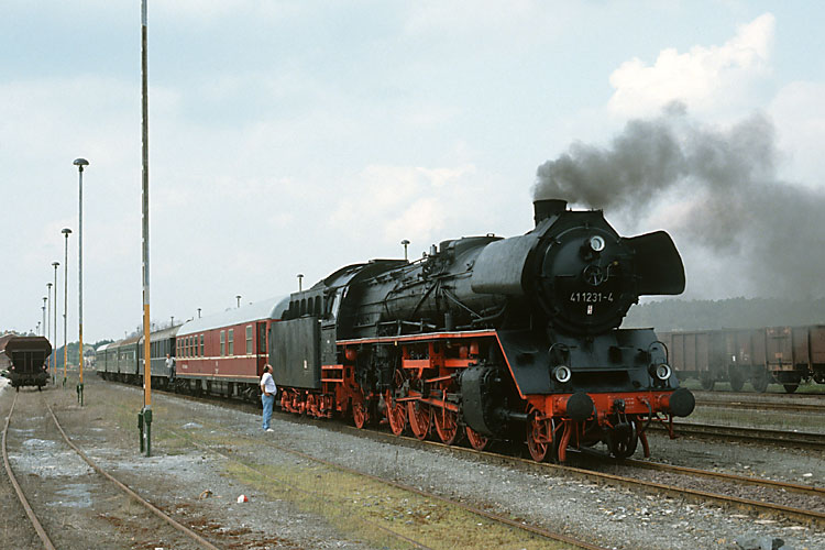 Für die Fahrt zur Walpurgis-Nacht in Schierke hatten wir uns eine etwas schnellere Lok bestellt, die Staßfurter 41 1231 brachte den Zug von Oebisfelde über Magdeburg-Halberstadt nach Wernigerode und zurück, hier bei einem Betriebshalt im Bahnhof Flechtingen, 30.04.1992. |
