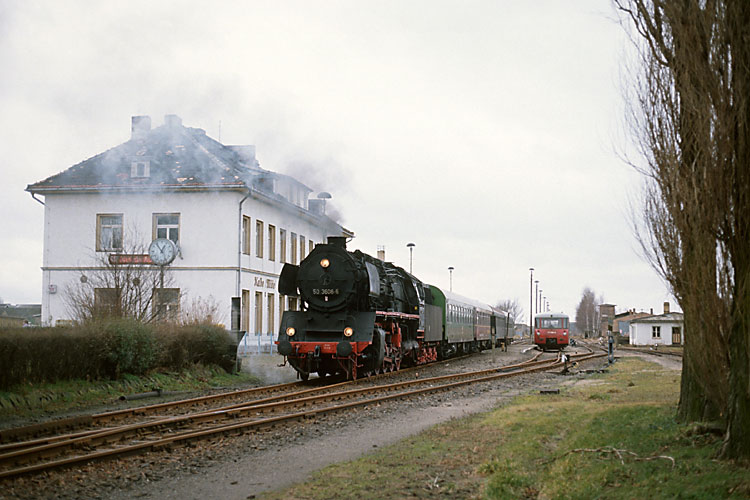 Am darauffolgenden Tag wurden aufgrund der großen Nachfrage noch zwei Zugpaare in der Relation Stendal-Kalbe und zurück gefahren. So war 50 3606 am Nachmittag des 13.12.1992 letztmals auf dem Weg nach Kalbe und durchfährt den Bahnhof Steinfeld. |