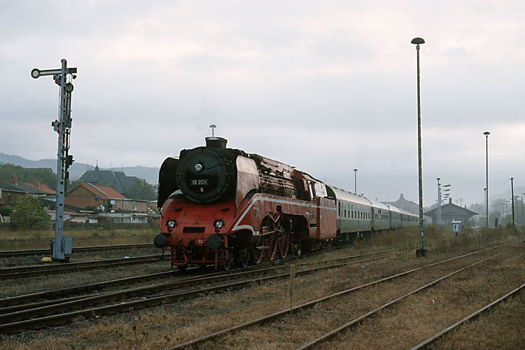 Eine Zeit lang fuhr 18 201 von Dampf Plus mit rot-schwarzer Lackierung durch die Lande. Zufällig sah ich sie so am 03.10.2003 in Wernigerode stehen, als sie zusammen mit der Glauchauer 118 770 einen Sonderzug im Auftrage des Sächsischen Eisenbahnmuseums Chemnitz-Hilbersdorf nach Wernigerode gebracht hatte und hier auf die Rückfahrt nach Chemnitz wartet. Heute ist die Lok wieder wie zu DDR-Zeiten grün-schwarz lackiert und wird derzeit in Nossen gepflegt. |