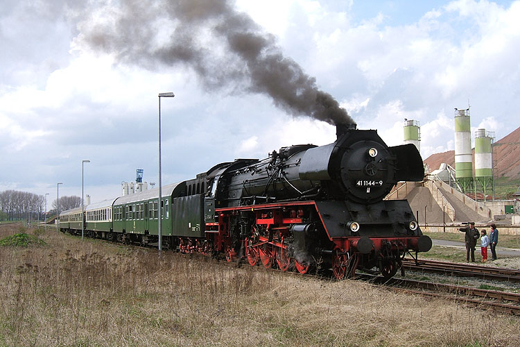 41 1144 - nach vielen Jahren wollte ich sie 2006 mal wieder sehen, schließlich war sie eine der Loks, mit denen ich die Eisenbahnfotografie begonnen hatte. Heute wird sie von der "IGE Werrabahn Eisenach e.V." gepflegt und steht oft im Einsatz. Eine der regelmäßig wiederkehrenden Bespannungsaufgaben ist der "Grubenexpress" Eisenach-Sondershausen", der für DB Regio Thüringen gefahren wird. Hier steht der Zug für die Rückfahrt auf dem Gelände des Erlebnisbergwerkes "Glückauf" Sondershausen bereit, das das Ziel dieser Touren ist, 22.04.2006. |