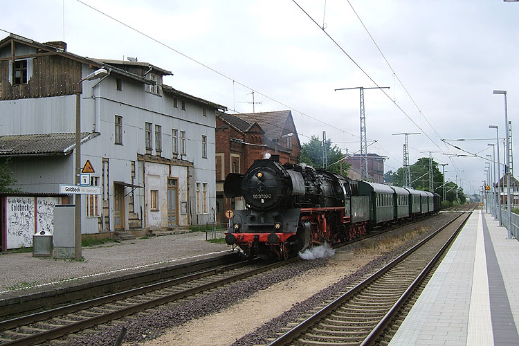 Zum Sachsen-Anhalt-Tag 2007 in Osterburg fuhren die Halberstädter ein Sonder-zugpaar mit ihrer 50 3708 dorthin. Am Nachmittag ging es für den Zug wieder heimwärts, er dampft an der Ruine des Bahnhofs Goldbeck vorbei, 02.06.2007. |